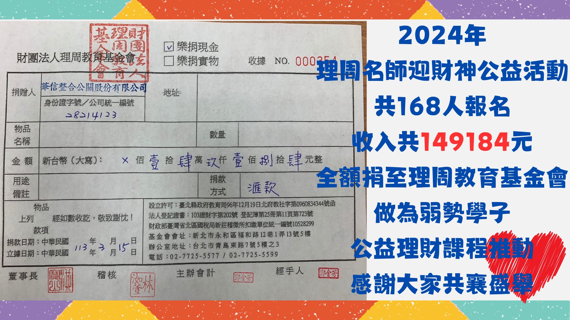 2024 理周教育學苑「理周名師迎財神」公益活動,捐贈善款助推弱勢學子!