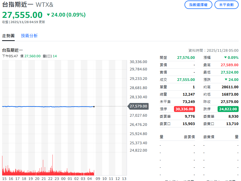 台指夜盤(11/27)在美股休市下就是狹幅居間震盪、振幅不到百點;最高27589、最低27524,收27555、下跌-24點,漲幅-0.09%、法人在日盤與夜盤籌碼不一致,三大法人日盤偏多+195口(外資+696口),夜盤偏空;富台-0.08%;