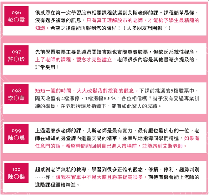 過去已有上千位學員佐證,採用最正確的操作邏輯,就能快速學會股市操作與提升績效!就算是交易小白也能從零開始、甚至單月獲利百萬與千萬!與其在市場上胡亂操作虧損繳學費,不如下定決心好好投資自己、可少走很多冤枉路!!