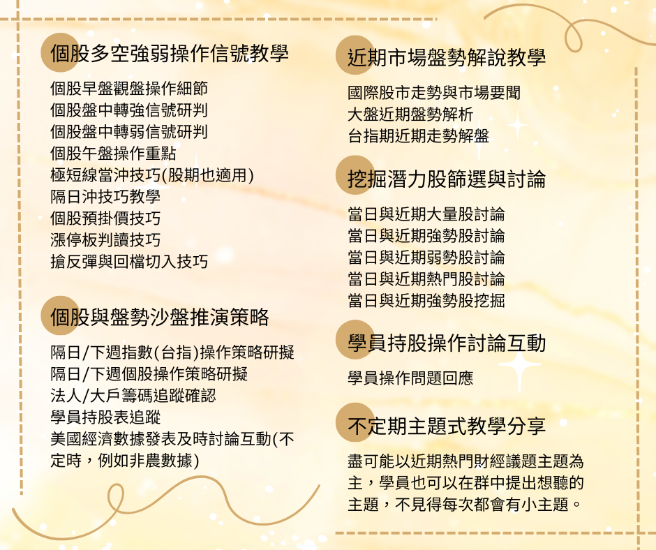 協助學員在股市操作上可以更加精進、並協助找出自己交易上的盲點