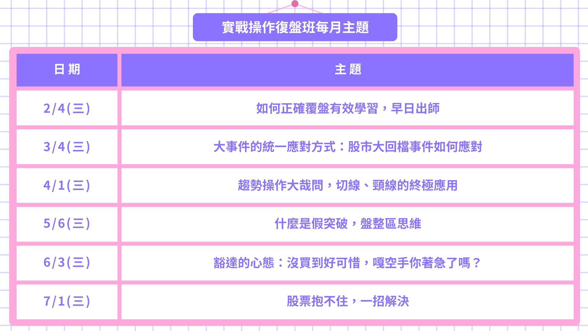 每月會有一個與波段交易密切相關的重要主題,如「如何辨別假突破?」「遇到重大事件如何應對?」或「進場點總是太早怎麼解?」,透過具體案例與市場實例,幫你建立清晰且可複製的操作思維。