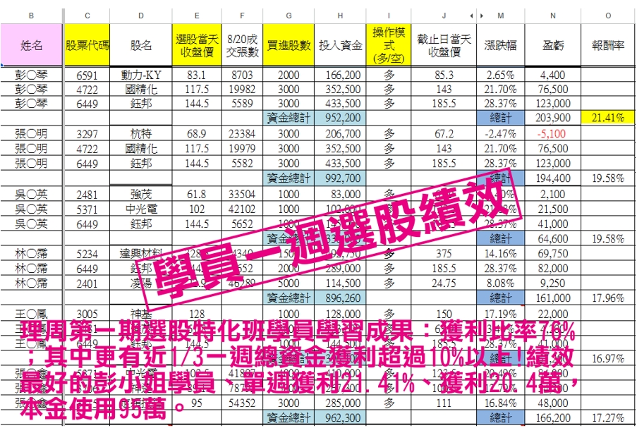 第一期選股特化班學員學習成果:獲利比率76%;其中更有近1/3一週總資金獲利超過10%以上!績效最好的彭小姐學員、單週獲利21.41%、獲利20.4萬,本金使用95萬。(註: