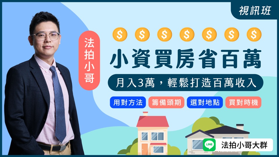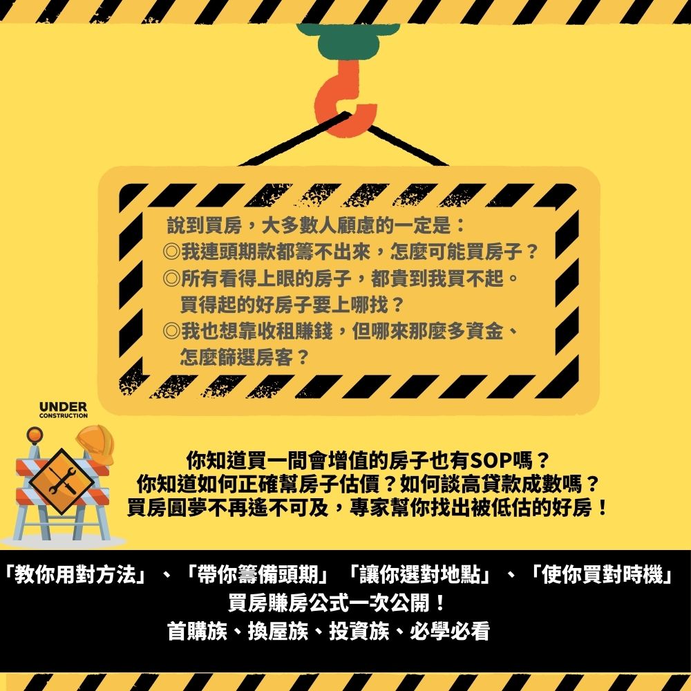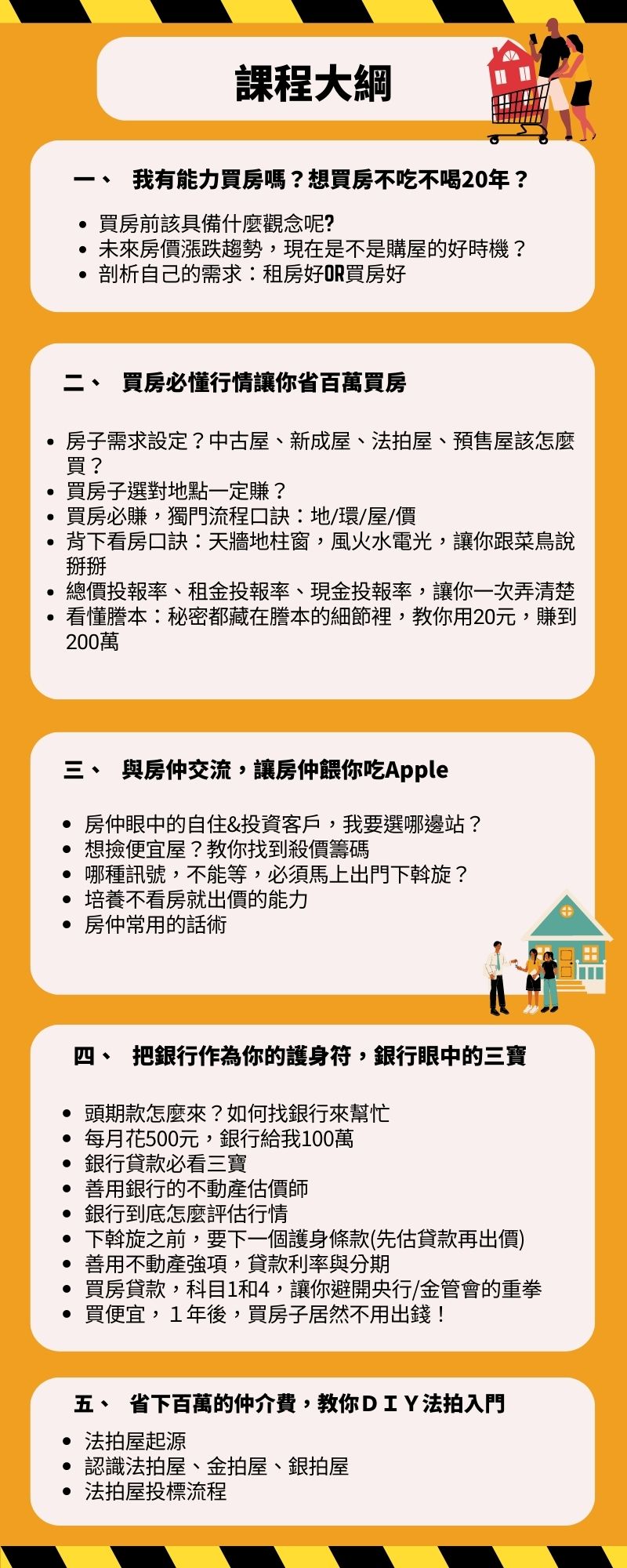 本課程係主講者分享其房產觀念及房屋買賣經驗,不保證投資房產獲利;不動產投資,具有風險性,請學員自行審慎考量後再行交易,任何投資房產之盈虧皆應由學員自行承擔,與本課程無涉。