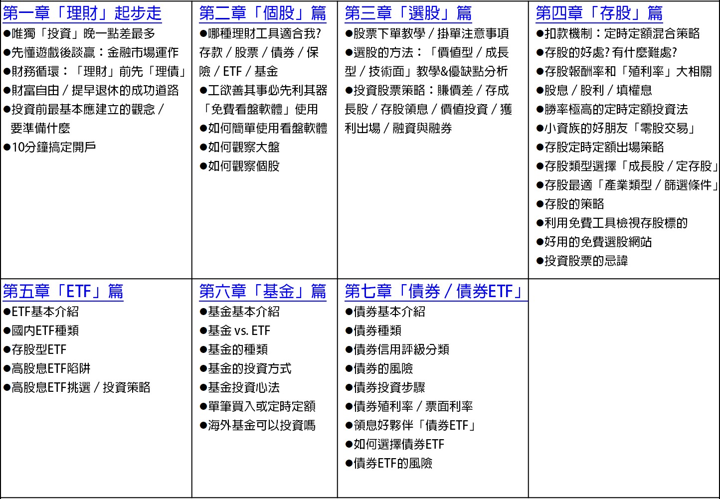 本課分成7個章節,學完對市場上所有的投資工具、交易策略及風險會有基本的輪廓
