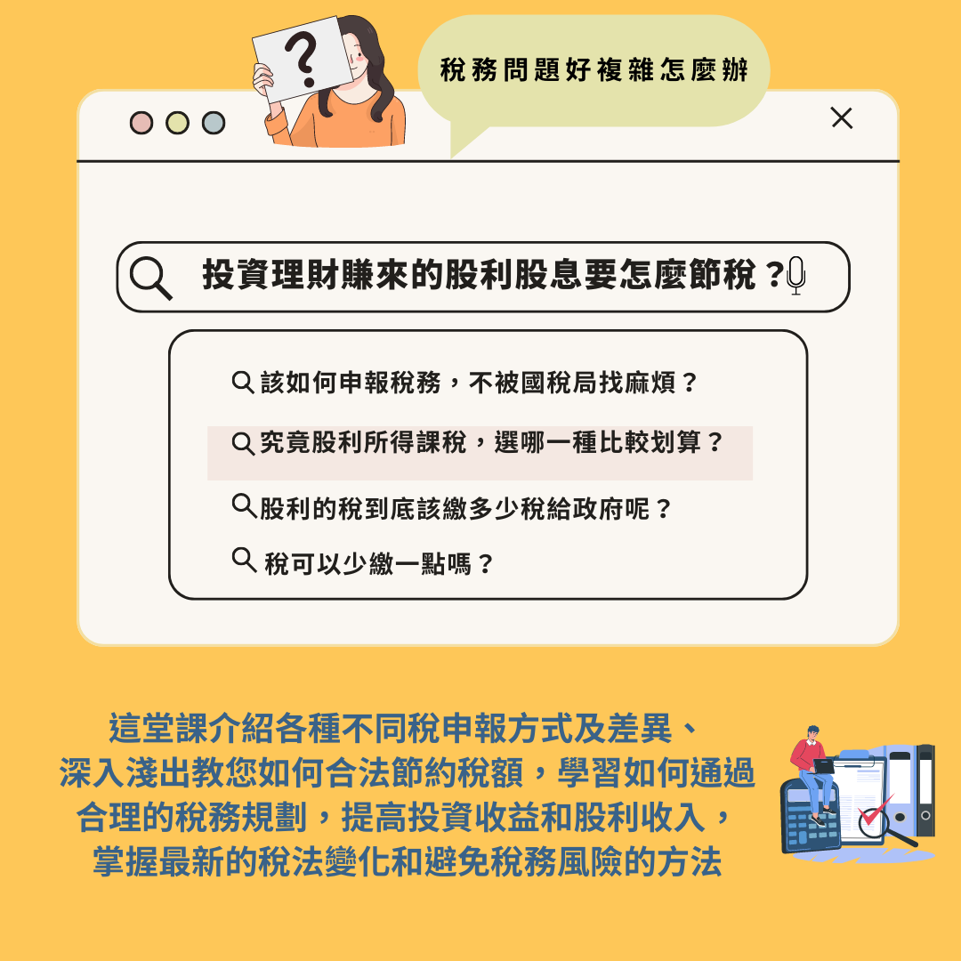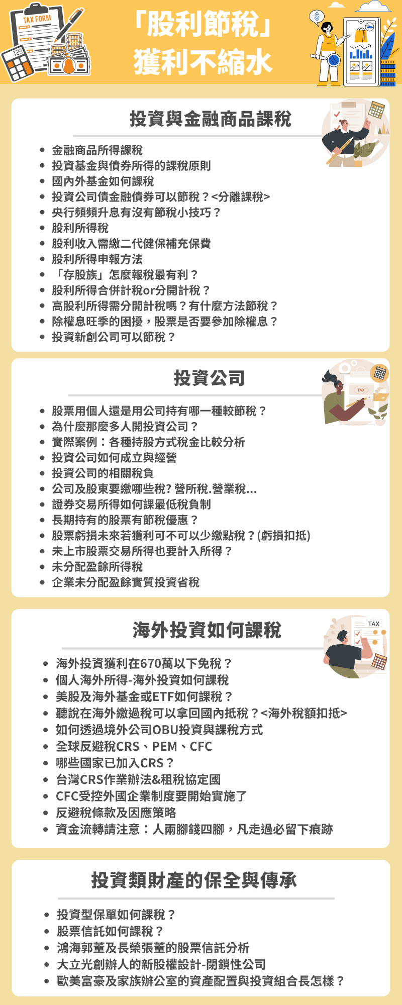 • 經常作投資理財人士想多了解投資的相關稅負及節稅方法
