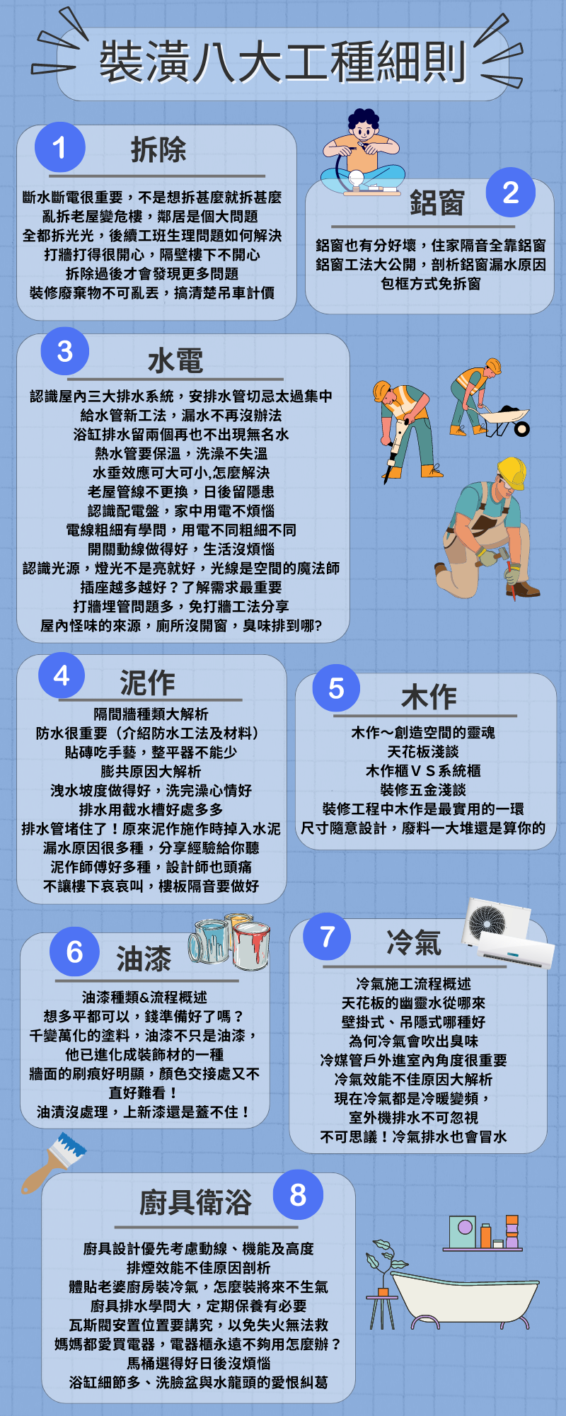 1.拆除 2.鋁窗 3.水電 4.泥作 5.木作 6.油漆 7.冷氣 8.廚具衛浴