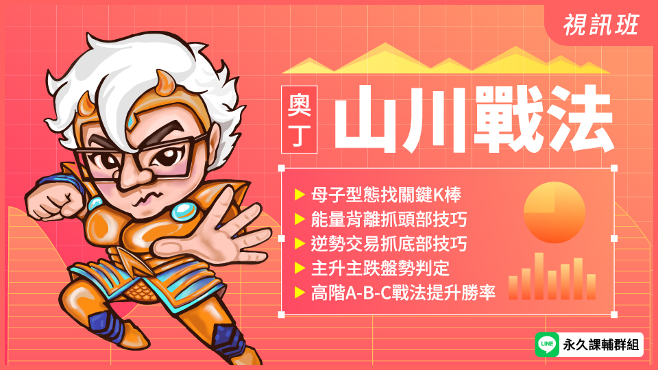 山川戰法是奧丁老師多年經驗的精華,母子型態判趨勢,找關鍵K棒,山川-抓頭部技巧,山川-抓底部技巧、三兵-主升段盤是判定、三空盼主力跳空缺口,最後加碼用山川戰法選股