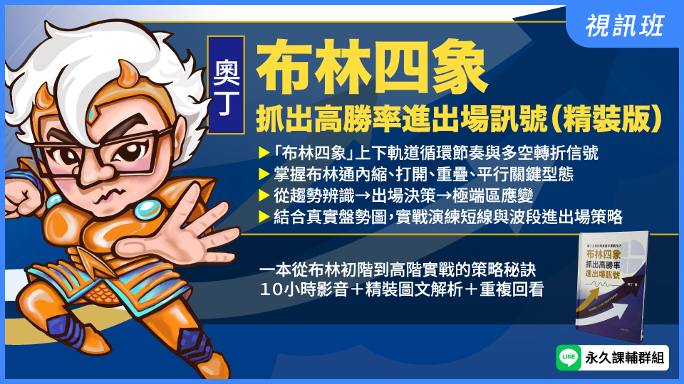 奧丁老師的布林四象 涵蓋 布林內縮 布林打開 布林平行向上/向下  布林平行 ,這四象限 判斷 大盤多空轉折 盤整 高檔 低檔 突破 跌破  強勢 弱勢 及進出場依據,適用於所有金融商品(台指期、台股、海期、黃金、原油等)